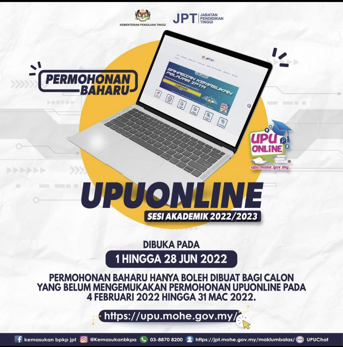 62200 Wilayah Persekutuan Putrajaya. Jabatan Pendidikan Tinggi Kementerian Pengajian Tinggi. Pembukaan Semula Permohonan UPU Berita baik kepada pelajar lepasan SPM 2021 UPUOnline akan dibuka semula untuk permohonan dan kemaskini.